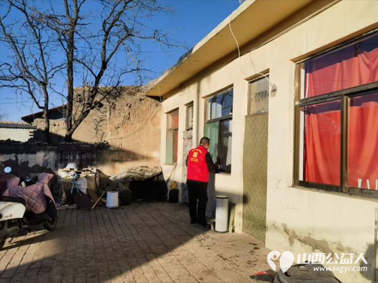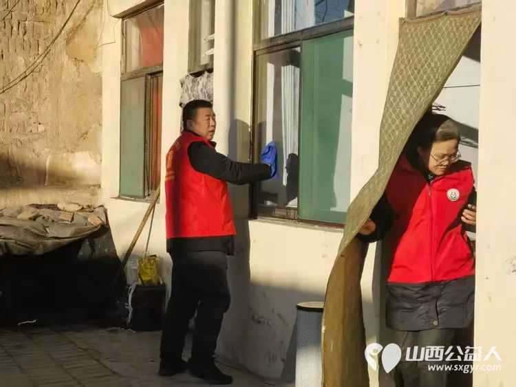 介休市敬老协会志愿者在绵山镇靳凌村入户85岁特困老人焦国良家为老人打扫室内外卫生做饭包饺子