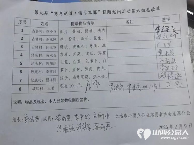为弘扬尊老敬老传统美德,传递社会关爱,2026年2月10日(农历腊月二十三),长治市小雨点公益志愿者协会思源分会成功组织开展第九期“寒冬送暖·情系孤寡”新春慰问活动。