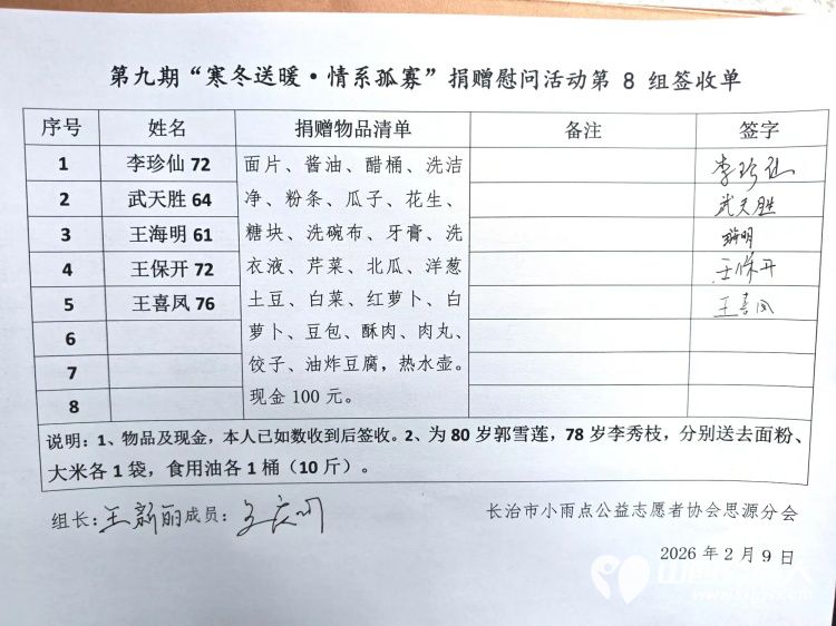 寒冬送暖情系孤寡(第六组)(第八组)----长治市小雨点公益志愿者协会思源分会2026年2月10日第九期慰问活动圆满成功