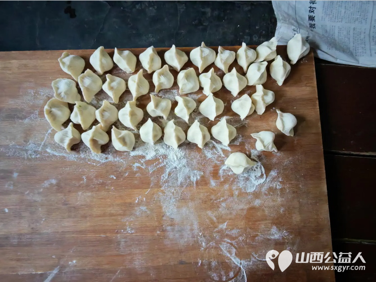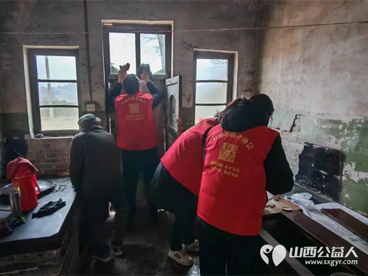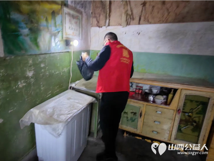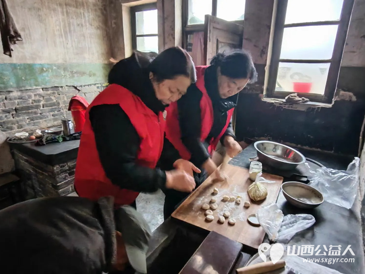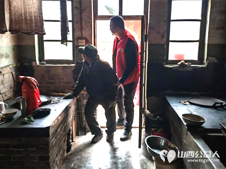 介休市敬老协会敬老助老活动----在义棠镇圪塔头村入户84岁特困庞海生老人家中为老人打扫室内外卫生做饭包饺子