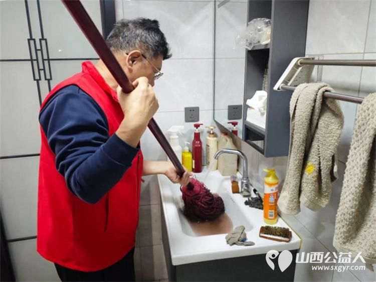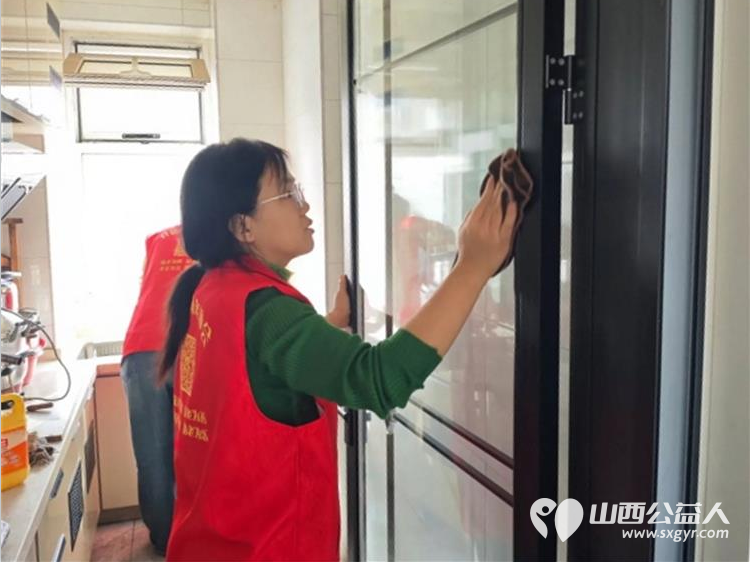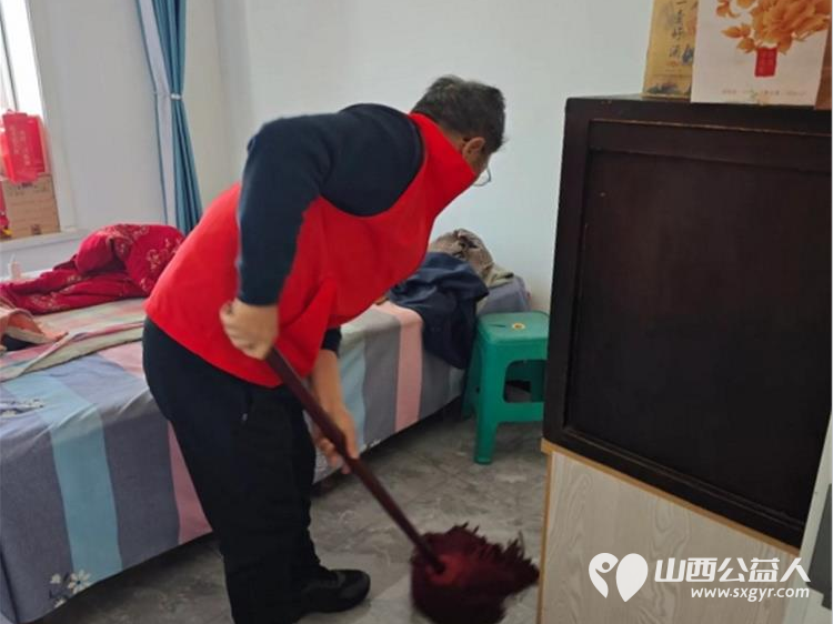 介休市敬老协会孝善行活动----志愿者们走进连福镇义和堡村入户82岁特困靳海成老人家中(现住顺康嘉苑1期5号楼)为老人打扫室内卫生
