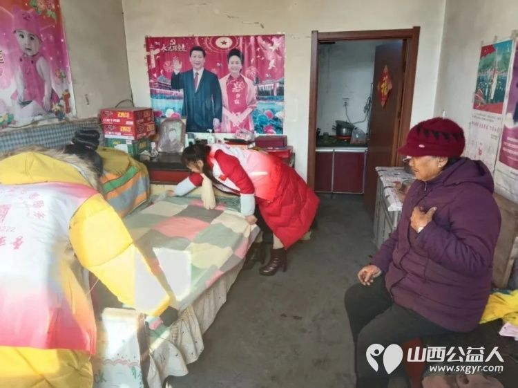 在壶关县东井岭乡牛家掌村,杨海燕老师与团队成员郭亚妮一同走访慰问村内困难户、军烈属,为他们送上醋、台历、红围巾、床单、对联等暖心慰问品,并与大家亲切交流,详细了解生活情况,提前送上浓浓的新春祝福。