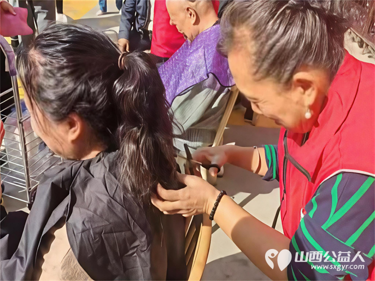 除专业健康义诊外,活动还针对社区老年居民,量身打造公益理发便民服务。志愿者们携带专业理发工具,在社区门口设立服务点位,耐心细致地为老人提供免费理发服务。