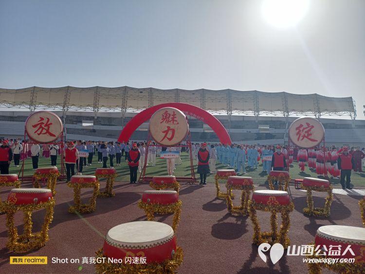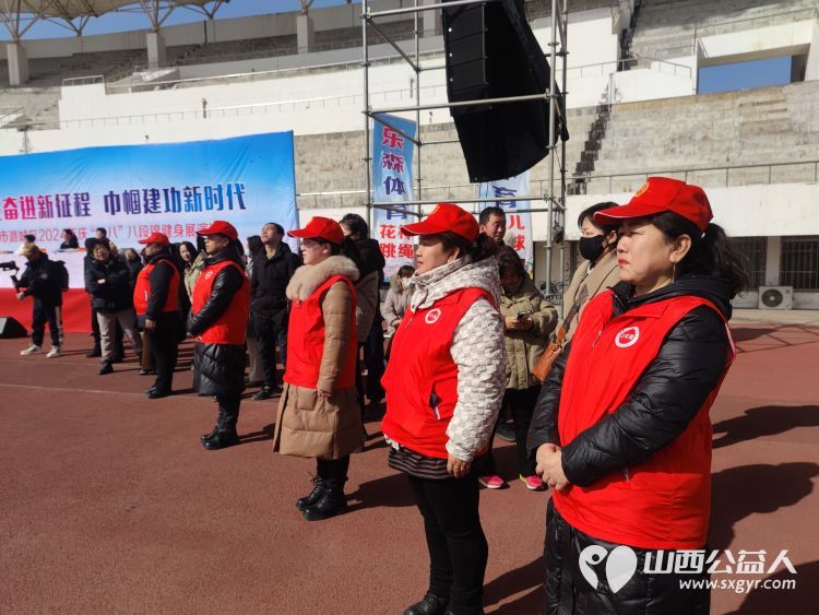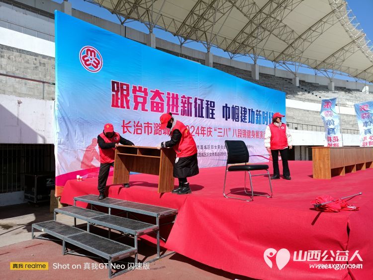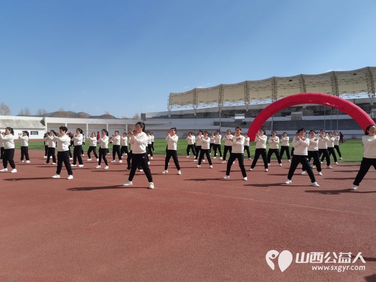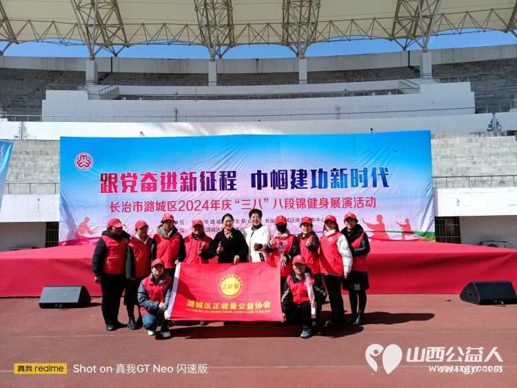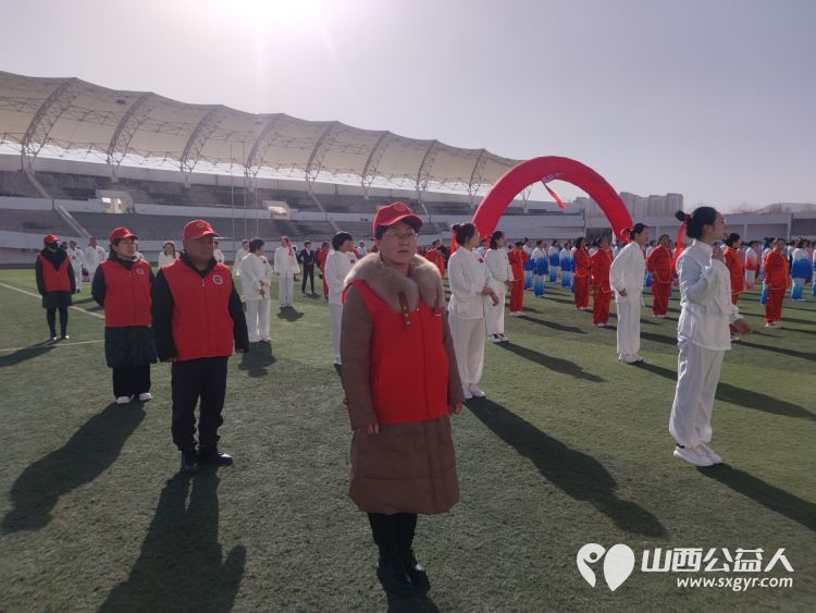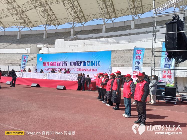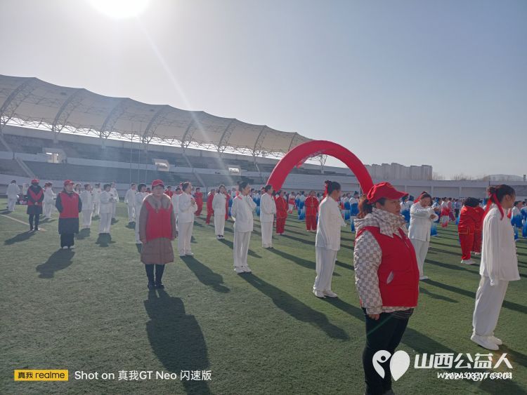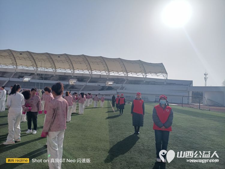 潞城区在体育场隆重开展庆祝“三八”八段锦健身展演活动正能量公益协会的志愿者们现场志愿服务
